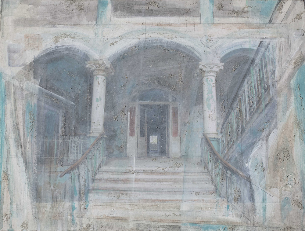 The Italian painter Daniela Gullotta deals with architecture in her works, whereby she is particularly interested in abandoned buildings that have been left to decay. Their magic and silent visualisation of the past form the inspiration and content of her works. In 2014, for example, she explored vacant buildings in Germany in a series of pictures, including the former sanatoriums in Beelitz, an abandoned, partially dilapidated sanatorium near Berlin, and the ruins of the old chemical plant in Rüdersdorf (Märkisch-Oderland). However, the artist also focusses on architecture whose function is still preserved, as in her series on Cologne Cathedral. However, she exposes it to destruction in her pictures by depicting its interior with the floor torn open. On the one hand, the artist reflects on the ongoing construction and restoration work on the cathedral, and on the other, she poses the question of its possible future in view of people's dwindling commitment to God.Gullotta focusses her artistic research primarily on the interiors of the architecture, which she initially captures in black and white photographs. Mounted on a painting surface, usually wood, she works on and expands them using various painting and drawing techniques in oil, acrylic, pencil and charcoal. Mixtures of sand and colour, fragments of canvas and gauze give the pictures a relief-like quality and emphasise that the photographic basis is secondary. In this way, the artist transforms real architecture into a fictitious one and allows the mysterious atmosphere of the abandoned buildings, steeped in the past and the generations of people who once animated them, to become tangible.