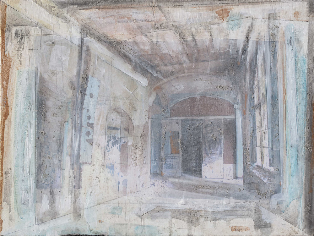 The Italian painter Daniela Gullotta deals with architecture in her works, whereby she is particularly interested in abandoned buildings that have been left to decay. Their magic and silent visualisation of the past form the inspiration and content of her works. In 2014, for example, she explored vacant buildings in Germany in a series of pictures, including the former sanatoriums in Beelitz, an abandoned, partially dilapidated sanatorium near Berlin, and the ruins of the old chemical plant in Rüdersdorf (Märkisch-Oderland). However, the artist also focusses on architecture whose function is still preserved, as in her series on Cologne Cathedral. However, she exposes it to destruction in her pictures by depicting its interior with the floor torn open. On the one hand, the artist reflects on the ongoing construction and restoration work on the cathedral, and on the other, she poses the question of its possible future in view of people's dwindling commitment to God.Gullotta focusses her artistic research primarily on the interiors of the architecture, which she initially captures in black and white photographs. Mounted on a painting surface, usually wood, she works on and expands them using various painting and drawing techniques in oil, acrylic, pencil and charcoal. Mixtures of sand and colour, fragments of canvas and gauze give the pictures a relief-like quality and emphasise that the photographic basis is secondary. In this way, the artist transforms real architecture into a fictitious one and allows the mysterious atmosphere of the abandoned buildings, steeped in the past and the generations of people who once animated them, to become tangible.