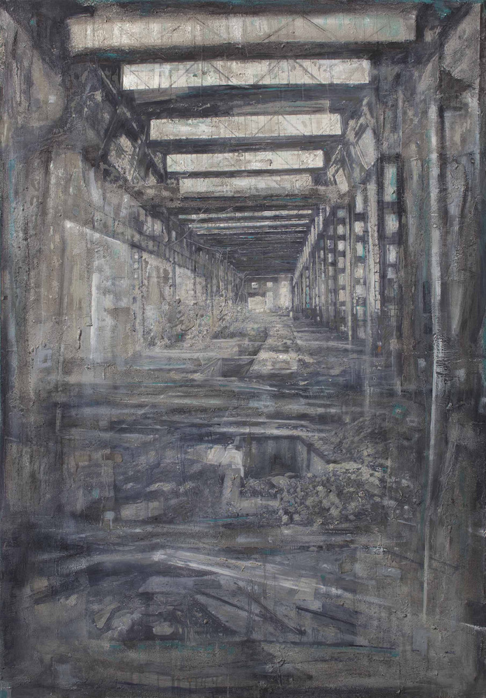 The Italian painter Daniela Gullotta deals with architecture in her works, whereby she is particularly interested in abandoned buildings that have been left to decay. Their magic and silent visualisation of the past form the inspiration and content of her works. In 2014, for example, she explored vacant buildings in Germany in a series of pictures, including the former sanatoriums in Beelitz, an abandoned, partially dilapidated sanatorium near Berlin, and the ruins of the old chemical plant in Rüdersdorf (Märkisch-Oderland). However, the artist also focusses on architecture whose function is still preserved, as in her series on Cologne Cathedral. However, she exposes it to destruction in her pictures by depicting its interior with the floor torn open. On the one hand, the artist reflects on the ongoing construction and restoration work on the cathedral, and on the other, she poses the question of its possible future in view of people's dwindling commitment to God.Gullotta focusses her artistic research primarily on the interiors of the architecture, which she initially captures in black and white photographs. Mounted on a painting surface, usually wood, she works on and expands them using various painting and drawing techniques in oil, acrylic, pencil and charcoal. Mixtures of sand and colour, fragments of canvas and gauze give the pictures a relief-like quality and emphasise that the photographic basis is secondary. In this way, the artist transforms real architecture into a fictitious one and allows the mysterious atmosphere of the abandoned buildings, steeped in the past and the generations of people who once animated them, to become tangible.