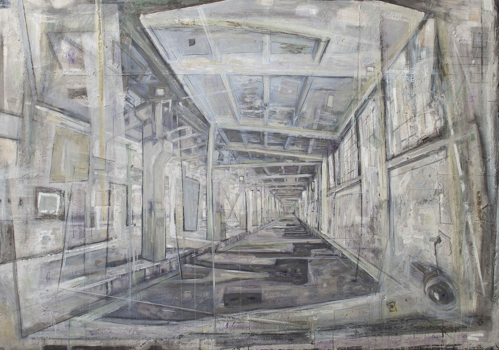 The Italian painter Daniela Gullotta deals with architecture in her works, whereby she is particularly interested in abandoned buildings that have been left to decay. Their magic and silent visualisation of the past form the inspiration and content of her works. In 2014, for example, she explored vacant buildings in Germany in a series of pictures, including the former sanatoriums in Beelitz, an abandoned, partially dilapidated sanatorium near Berlin, and the ruins of the old chemical plant in Rüdersdorf (Märkisch-Oderland). However, the artist also focusses on architecture whose function is still preserved, as in her series on Cologne Cathedral. However, she exposes it to destruction in her pictures by depicting its interior with the floor torn open. On the one hand, the artist reflects on the ongoing construction and restoration work on the cathedral, and on the other, she poses the question of its possible future in view of people's dwindling commitment to God.Gullotta focusses her artistic research primarily on the interiors of the architecture, which she initially captures in black and white photographs. Mounted on a painting surface, usually wood, she works on and expands them using various painting and drawing techniques in oil, acrylic, pencil and charcoal. Mixtures of sand and colour, fragments of canvas and gauze give the pictures a relief-like quality and emphasise that the photographic basis is secondary. In this way, the artist transforms real architecture into a fictitious one and allows the mysterious atmosphere of the abandoned buildings, steeped in the past and the generations of people who once animated them, to become tangible.