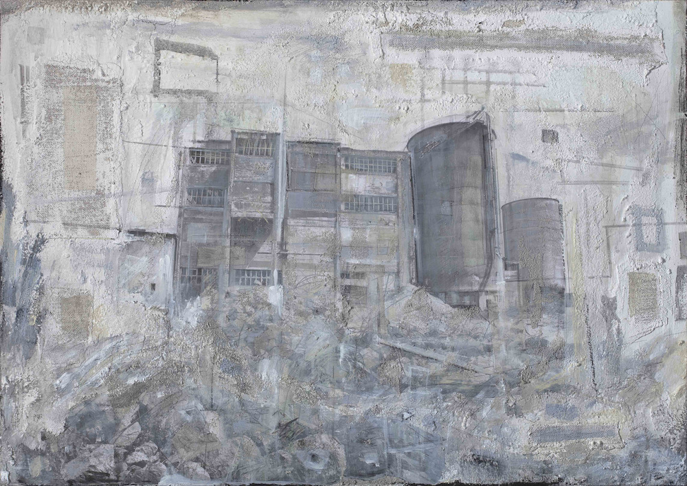 The Italian painter Daniela Gullotta deals with architecture in her works, whereby she is particularly interested in abandoned buildings that have been left to decay. Their magic and silent visualisation of the past form the inspiration and content of her works. In 2014, for example, she explored vacant buildings in Germany in a series of pictures, including the former sanatoriums in Beelitz, an abandoned, partially dilapidated sanatorium near Berlin, and the ruins of the old chemical plant in Rüdersdorf (Märkisch-Oderland). However, the artist also focusses on architecture whose function is still preserved, as in her series on Cologne Cathedral. However, she exposes it to destruction in her pictures by depicting its interior with the floor torn open. On the one hand, the artist reflects on the ongoing construction and restoration work on the cathedral, and on the other, she poses the question of its possible future in view of people's dwindling commitment to God.Gullotta focusses her artistic research primarily on the interiors of the architecture, which she initially captures in black and white photographs. Mounted on a painting surface, usually wood, she works on and expands them using various painting and drawing techniques in oil, acrylic, pencil and charcoal. Mixtures of sand and colour, fragments of canvas and gauze give the pictures a relief-like quality and emphasise that the photographic basis is secondary. In this way, the artist transforms real architecture into a fictitious one and allows the mysterious atmosphere of the abandoned buildings, steeped in the past and the generations of people who once animated them, to become tangible.