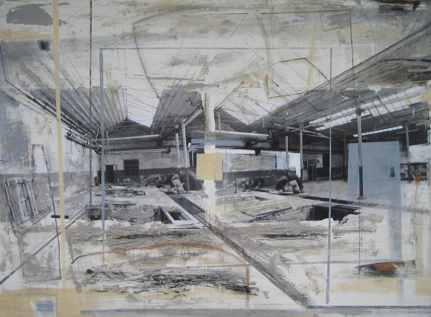 The Italian painter Daniela Gullotta deals with architecture in her works, whereby she is particularly interested in abandoned buildings that have been left to decay. Their magic and silent visualisation of the past form the inspiration and content of her works. In 2014, for example, she explored vacant buildings in Germany in a series of pictures, including the former sanatoriums in Beelitz, an abandoned, partially dilapidated sanatorium near Berlin, and the ruins of the old chemical plant in Rüdersdorf (Märkisch-Oderland). However, the artist also focusses on architecture whose function is still preserved, as in her series on Cologne Cathedral. However, she exposes it to destruction in her pictures by depicting its interior with the floor torn open. On the one hand, the artist reflects on the ongoing construction and restoration work on the cathedral, and on the other, she poses the question of its possible future in view of people's dwindling commitment to God.Gullotta focusses her artistic research primarily on the interiors of the architecture, which she initially captures in black and white photographs. Mounted on a painting surface, usually wood, she works on and expands them using various painting and drawing techniques in oil, acrylic, pencil and charcoal. Mixtures of sand and colour, fragments of canvas and gauze give the pictures a relief-like quality and emphasise that the photographic basis is secondary. In this way, the artist transforms real architecture into a fictitious one and allows the mysterious atmosphere of the abandoned buildings, steeped in the past and the generations of people who once animated them, to become tangible.