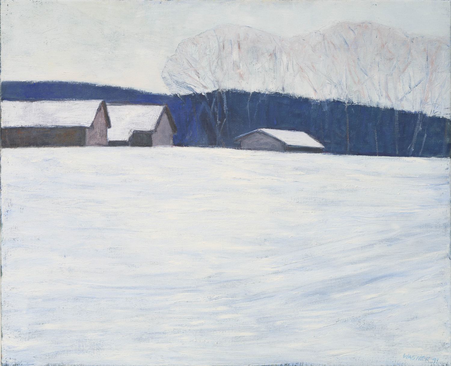Reiner Wagner was born in Hildesheim in 1942. Coming from a family of musicians, he learnt to play the violin as a child, then the piano and sang in a boys' choir. In 1957, during a holiday on the island of Corsica, he discovered his love of painting. After finishing school, Wagner finally decided against a career as a musician and studied from 1961 to 1964, first at the Academy of Fine Arts in Munich (under Hermann Kasper) and then at the Academy of Fine Arts in Berlin. In 1965, Wagner moved to Corsica with his wife Ingrid, where he created his first landscape paintings of the Mediterranean island. After the birth of their first son, Wagner first moved to Munich, then to Lake Starnberg when their second son was born. A friendly relationship developed with Galerie Günther Franke, Munich, which represented the artist from 1972-1977, with Galerie Gunzenhauser, Munich, which exhibited Wagner from 1978-2001 and looked after his work (1996 catalogue raisonné, 1965-1995), and then from 1989 with Galerie Koch in Hanover. Wagner's first museum exhibition took place in 1979 at the Weilheim City Museum (also 1981, 1992, 2002), followed by exhibitions at the Schongau City Museum (1990, 1994). To this day, Wagner regularly shows his works at the Galerie Koch in Hanover. - Wagner's work includes oil paintings, watercolours and woodcuts of landscapes and still lifes. His landscapes always reflect his living environment, on the one hand the Bavarian Alpine foothills from Lake Starnberg southwards towards the towns of Iffeldorf, Kochel, Murnau with their lakes, moors and the Bavarian Alps, from the Walchensee mountains and Walchensee via Krün, Wallgau to the Karwendel mountains, and on the other hand the western Corsican, Mediterranean mountain landscape with the sea, which the painter still visits in the summer months. Wagner's landscapes, although orientated towards visible reality, are by no means vedute, but reduce the nature seen to its essential forms, reflecting its atmospheric mood as well as the painter's own experience, his dialogue with nature. Wagner's landscapes often consist of clearly separated landscape zones, sometimes layered parallel to one another in the painting. The colour palette is reduced to a few colours, even concentrating on just one colour in various shades of light and dark (e.g. Walchensee pictures). The renunciation of details, the tendency to combine diversity into a few large areas and the reduction of the richness of colour simplify and abstract the natural model, allowing the eye to linger. Impressions such as seriousness, calm, inwardness, loneliness, emptiness, but also cheerfulness and clarity are part of his landscape paintings.Although people are absent from Reiner Wagner's landscapes, he does not show unspoilt nature. Paths, barns, farmsteads and boathouses, which the artist reduces to their basic forms, bear witness to the presence of man. With their red, orange-red, blue or violet colouring, the roofs of the barns often form a clear colour accent in the composition, sometimes complementing the green of the flora or the blue of the sky and the mountains; a creative intervention in the topographically given, which underlines the fact that Wagner's landscape paintings are not an image of what he has seen, but a mental processing of what he has seen. This also characterises Wagner's still lifes, which show objects from his immediate living and working environment: Cups, bowls and plates, fruit, individual flowers in often glass vessels as well as the painter's working materials, paint tubes, chalks, paint tins and brushes. The creative impulse is usually triggered by a random constellation of these objects, but his still lifes are also strictly composed and characterised by the same asceticism as his landscape paintings. Only a few objects occupy the compositions; they are displayed in an intimate, spaceless manner. The viewer's gaze can rest entirely on the individual objects; their presentation surfaces and the background are usually almost monochrome. The outlines of the slightly abstractly depicted objects are firm and clearly contoured, their colours bright, detached from the original colour of the object and set in relation to the colour tones of the surface and background. It is clear that Wagner does not strive for mimesis in his still lifes either, but instead achieves a different, new creation by mentally processing what he has seen. It is not without reason that a conversation with Reiner Wagner in 2006 was introduced with Johann Wolfgang von Goethe's aphorism: "Art: another nature, also mysterious, but more comprehensible; for it springs from the mind."