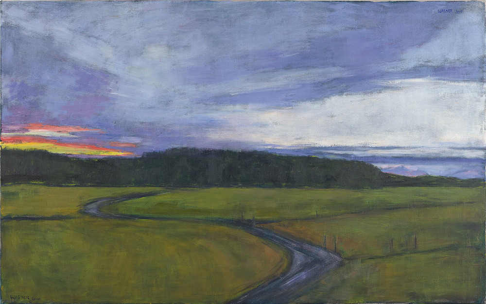 The composition created in 2020 shows the view over an open, slightly hilly meadow landscape towards a dark green forest and, to the right, the Karwendel mountains in the far distance. The expansive, partly light violet-blue evening sky is streaked with white and grey clouds. Behind the forest, to which a winding path leads, the setting sun colours the sky bright yellow, orange-red and pink.