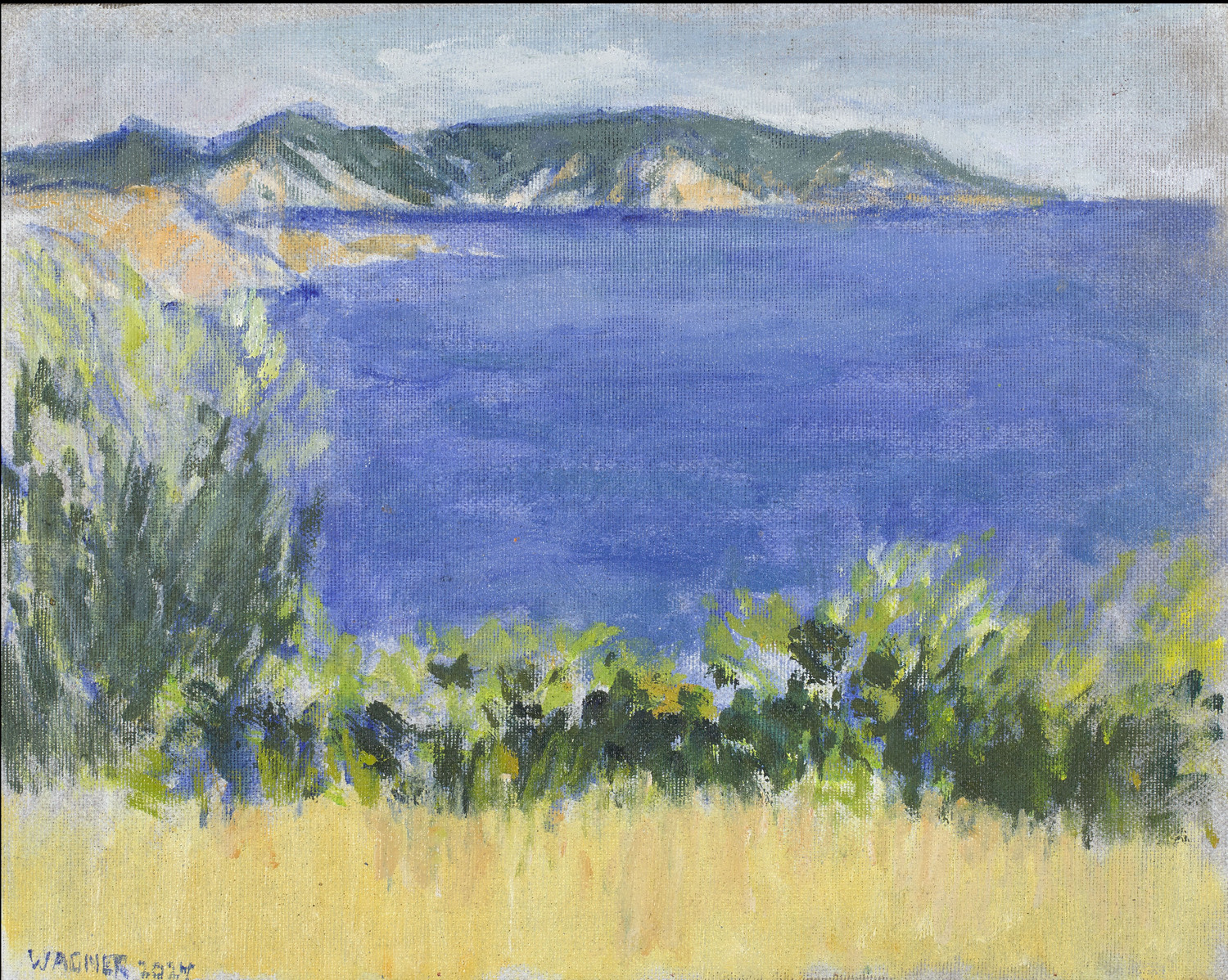 Reiner Wagner was born in Hildesheim in 1942. Coming from a family of musicians, he learnt to play the violin as a child, then the piano and sang in a boys' choir. In 1957, during a holiday on the island of Corsica, he discovered his love of painting. After finishing school, Wagner finally decided against a career as a musician and studied from 1961 to 1964, first at the Academy of Fine Arts in Munich (under Hermann Kasper) and then at the Academy of Fine Arts in Berlin. In 1965, Wagner moved to Corsica with his wife Ingrid, where he created his first landscape paintings of the Mediterranean island. After the birth of their first son, Wagner first moved to Munich, then to Lake Starnberg when their second son was born. A friendly relationship developed with Galerie Günther Franke, Munich, which represented the artist from 1972-1977, with Galerie Gunzenhauser, Munich, which exhibited Wagner from 1978-2001 and looked after his work (1996 catalogue raisonné, 1965-1995), and then from 1989 with Galerie Koch in Hanover. Wagner's first museum exhibition took place in 1979 at the Weilheim City Museum (also 1981, 1992, 2002), followed by exhibitions at the Schongau City Museum (1990, 1994). To this day, Wagner regularly shows his works at the Galerie Koch in Hanover. - Wagner's work includes oil paintings, watercolours and woodcuts of landscapes and still lifes. His landscapes always reflect his living environment, on the one hand the Bavarian Alpine foothills from Lake Starnberg southwards towards the towns of Iffeldorf, Kochel, Murnau with their lakes, moors and the Bavarian Alps, from the Walchensee mountains and Walchensee via Krün, Wallgau to the Karwendel mountains, and on the other hand the western Corsican, Mediterranean mountain landscape with the sea, which the painter still visits in the summer months. Wagner's landscapes, although orientated towards visible reality, are by no means vedute, but reduce the nature seen to its essential forms, reflecting its atmospheric mood as well as the painter's own experience, his dialogue with nature. Wagner's landscapes often consist of clearly separated landscape zones, sometimes layered parallel to one another in the painting. The colour palette is reduced to a few colours, even concentrating on just one colour in various shades of light and dark (e.g. Walchensee pictures). The renunciation of details, the tendency to combine diversity into a few large areas and the reduction of the richness of colour simplify and abstract the natural model, allowing the eye to linger. Impressions such as seriousness, calm, inwardness, loneliness, emptiness, but also cheerfulness and clarity are part of his landscape paintings.Although people are absent from Reiner Wagner's landscapes, he does not show unspoilt nature. Paths, barns, farmsteads and boathouses, which the artist reduces to their basic forms, bear witness to the presence of man. With their red, orange-red, blue or violet colouring, the roofs of the barns often form a clear colour accent in the composition, sometimes complementing the green of the flora or the blue of the sky and the mountains; a creative intervention in the topographically given, which underlines the fact that Wagner's landscape paintings are not an image of what he has seen, but a mental processing of what he has seen. This also characterises Wagner's still lifes, which show objects from his immediate living and working environment: Cups, bowls and plates, fruit, individual flowers in often glass vessels as well as the painter's working materials, paint tubes, chalks, paint tins and brushes. The creative impulse is usually triggered by a random constellation of these objects, but his still lifes are also strictly composed and characterised by the same asceticism as his landscape paintings. Only a few objects occupy the compositions; they are displayed in an intimate, spaceless manner. The viewer's gaze can rest entirely on the individual objects; their presentation surfaces and the background are usually almost monochrome. The outlines of the slightly abstractly depicted objects are firm and clearly contoured, their colours bright, detached from the original colour of the object and set in relation to the colour tones of the surface and background. It is clear that Wagner does not strive for mimesis in his still lifes either, but instead achieves a different, new creation by mentally processing what he has seen. It is not without reason that a conversation with Reiner Wagner in 2006 was introduced with Johann Wolfgang von Goethe's aphorism: "Art: another nature, also mysterious, but more comprehensible; for it springs from the mind."