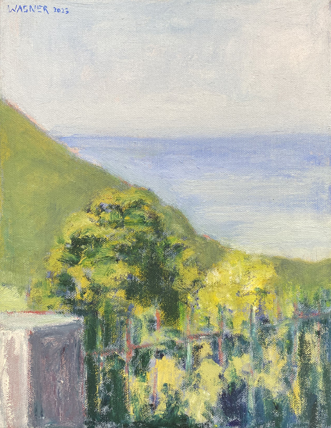 Reiner Wagner was born in Hildesheim in 1942. Coming from a family of musicians, he learnt to play the violin as a child, then the piano and sang in a boys' choir. In 1957, during a holiday on the island of Corsica, he discovered his love of painting. After finishing school, Wagner finally decided against a career as a musician and studied from 1961 to 1964, first at the Academy of Fine Arts in Munich (under Hermann Kasper) and then at the Academy of Fine Arts in Berlin. In 1965, Wagner moved to Corsica with his wife Ingrid, where he created his first landscape paintings of the Mediterranean island. After the birth of their first son, Wagner first moved to Munich, then to Lake Starnberg when their second son was born. A friendly relationship developed with Galerie Günther Franke, Munich, which represented the artist from 1972-1977, with Galerie Gunzenhauser, Munich, which exhibited Wagner from 1978-2001 and looked after his work (1996 catalogue raisonné, 1965-1995), and then from 1989 with Galerie Koch in Hanover. Wagner's first museum exhibition took place in 1979 at the Weilheim City Museum (also 1981, 1992, 2002), followed by exhibitions at the Schongau City Museum (1990, 1994). To this day, Wagner regularly shows his works at the Galerie Koch in Hanover. - Wagner's work includes oil paintings, watercolours and woodcuts of landscapes and still lifes. His landscapes always reflect his living environment, on the one hand the Bavarian Alpine foothills from Lake Starnberg southwards towards the towns of Iffeldorf, Kochel, Murnau with their lakes, moors and the Bavarian Alps, from the Walchensee mountains and Walchensee via Krün, Wallgau to the Karwendel mountains, and on the other hand the western Corsican, Mediterranean mountain landscape with the sea, which the painter still visits in the summer months. Wagner's landscapes, although orientated towards visible reality, are by no means vedute, but reduce the nature seen to its essential forms, reflecting its atmospheric mood as well as the painter's own experience, his dialogue with nature. Wagner's landscapes often consist of clearly separated landscape zones, sometimes layered parallel to one another in the painting. The colour palette is reduced to a few colours, even concentrating on just one colour in various shades of light and dark (e.g. Walchensee pictures). The renunciation of details, the tendency to combine diversity into a few large areas and the reduction of the richness of colour simplify and abstract the natural model, allowing the eye to linger. Impressions such as seriousness, calm, inwardness, loneliness, emptiness, but also cheerfulness and clarity are part of his landscape paintings.Although people are absent from Reiner Wagner's landscapes, he does not show unspoilt nature. Paths, barns, farmsteads and boathouses, which the artist reduces to their basic forms, bear witness to the presence of man. With their red, orange-red, blue or violet colouring, the roofs of the barns often form a clear colour accent in the composition, sometimes complementing the green of the flora or the blue of the sky and the mountains; a creative intervention in the topographically given, which underlines the fact that Wagner's landscape paintings are not an image of what he has seen, but a mental processing of what he has seen. This also characterises Wagner's still lifes, which show objects from his immediate living and working environment: Cups, bowls and plates, fruit, individual flowers in often glass vessels as well as the painter's working materials, paint tubes, chalks, paint tins and brushes. The creative impulse is usually triggered by a random constellation of these objects, but his still lifes are also strictly composed and characterised by the same asceticism as his landscape paintings. Only a few objects occupy the compositions; they are displayed in an intimate, spaceless manner. The viewer's gaze can rest entirely on the individual objects; their presentation surfaces and the background are usually almost monochrome. The outlines of the slightly abstractly depicted objects are firm and clearly contoured, their colours bright, detached from the original colour of the object and set in relation to the colour tones of the surface and background. It is clear that Wagner does not strive for mimesis in his still lifes either, but instead achieves a different, new creation by mentally processing what he has seen. It is not without reason that a conversation with Reiner Wagner in 2006 was introduced with Johann Wolfgang von Goethe's aphorism: "Art: another nature, also mysterious, but more comprehensible; for it springs from the mind."