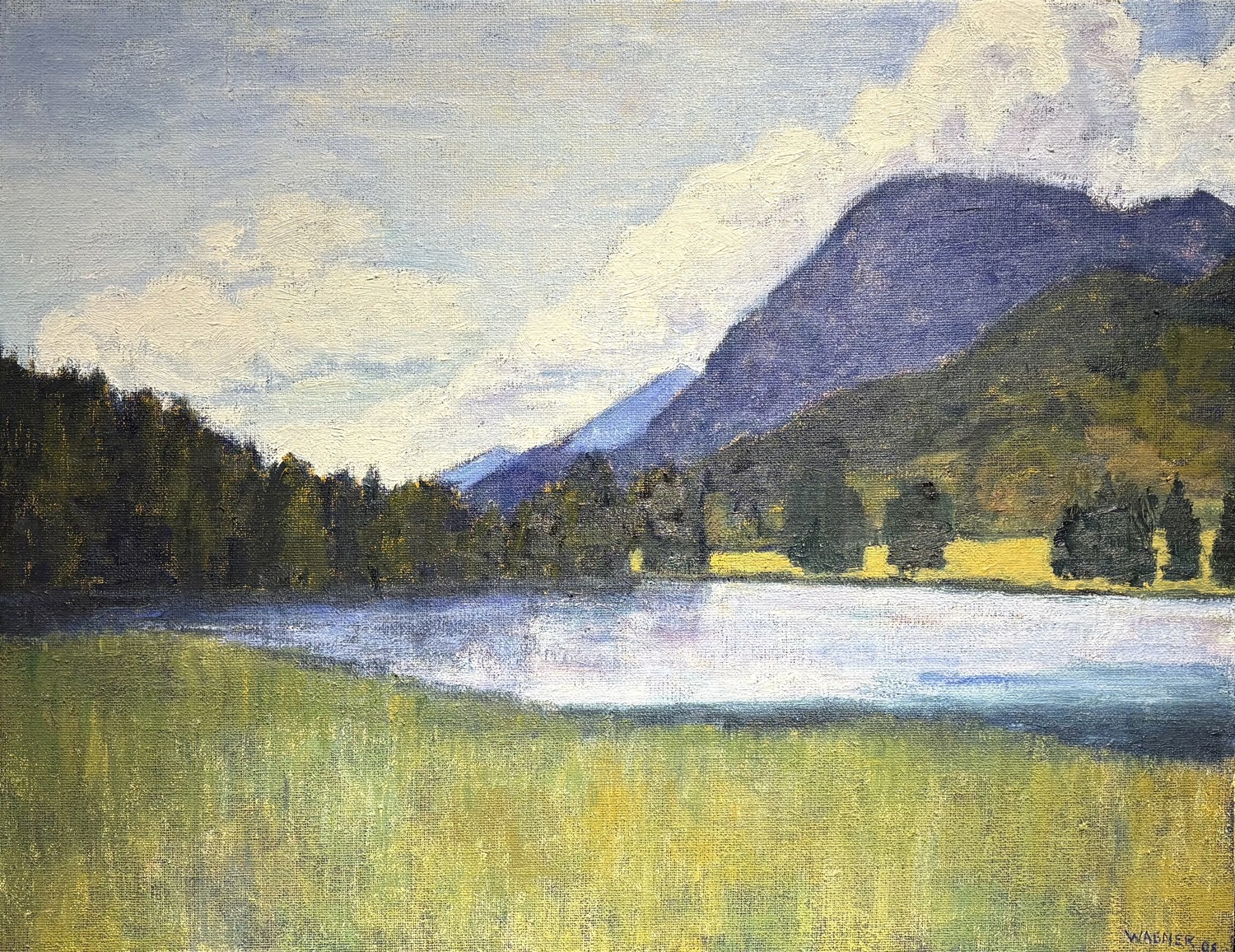 Reiner Wagner was born in Hildesheim in 1942. Coming from a family of musicians, he learnt to play the violin as a child, then the piano and sang in a boys' choir. In 1957, during a holiday on the island of Corsica, he discovered his love of painting. After finishing school, Wagner finally decided against a career as a musician and studied from 1961 to 1964, first at the Academy of Fine Arts in Munich (under Hermann Kasper) and then at the Academy of Fine Arts in Berlin. In 1965, Wagner moved to Corsica with his wife Ingrid, where he created his first landscape paintings of the Mediterranean island. After the birth of their first son, Wagner first moved to Munich, then to Lake Starnberg when their second son was born. A friendly relationship developed with Galerie Günther Franke, Munich, which represented the artist from 1972-1977, with Galerie Gunzenhauser, Munich, which exhibited Wagner from 1978-2001 and looked after his work (1996 catalogue raisonné, 1965-1995), and then from 1989 with Galerie Koch in Hanover. Wagner's first museum exhibition took place in 1979 at the Weilheim City Museum (also 1981, 1992, 2002), followed by exhibitions at the Schongau City Museum (1990, 1994). To this day, Wagner regularly shows his works at the Galerie Koch in Hanover. - Wagner's work includes oil paintings, watercolours and woodcuts of landscapes and still lifes. His landscapes always reflect his living environment, on the one hand the Bavarian Alpine foothills from Lake Starnberg southwards towards the towns of Iffeldorf, Kochel, Murnau with their lakes, moors and the Bavarian Alps, from the Walchensee mountains and Walchensee via Krün, Wallgau to the Karwendel mountains, and on the other hand the western Corsican, Mediterranean mountain landscape with the sea, which the painter still visits in the summer months. Wagner's landscapes, although orientated towards visible reality, are by no means vedute, but reduce the nature seen to its essential forms, reflecting its atmospheric mood as well as the painter's own experience, his dialogue with nature. Wagner's landscapes often consist of clearly separated landscape zones, sometimes layered parallel to one another in the painting. The colour palette is reduced to a few colours, even concentrating on just one colour in various shades of light and dark (e.g. Walchensee pictures). The renunciation of details, the tendency to combine diversity into a few large areas and the reduction of the richness of colour simplify and abstract the natural model, allowing the eye to linger. Impressions such as seriousness, calm, inwardness, loneliness, emptiness, but also cheerfulness and clarity are part of his landscape paintings.Although people are absent from Reiner Wagner's landscapes, he does not show unspoilt nature. Paths, barns, farmsteads and boathouses, which the artist reduces to their basic forms, bear witness to the presence of man. With their red, orange-red, blue or violet colouring, the roofs of the barns often form a clear colour accent in the composition, sometimes complementing the green of the flora or the blue of the sky and the mountains; a creative intervention in the topographically given, which underlines the fact that Wagner's landscape paintings are not an image of what he has seen, but a mental processing of what he has seen. This also characterises Wagner's still lifes, which show objects from his immediate living and working environment: Cups, bowls and plates, fruit, individual flowers in often glass vessels as well as the painter's working materials, paint tubes, chalks, paint tins and brushes. The creative impulse is usually triggered by a random constellation of these objects, but his still lifes are also strictly composed and characterised by the same asceticism as his landscape paintings. Only a few objects occupy the compositions; they are displayed in an intimate, spaceless manner. The viewer's gaze can rest entirely on the individual objects; their presentation surfaces and the background are usually almost monochrome. The outlines of the slightly abstractly depicted objects are firm and clearly contoured, their colours bright, detached from the original colour of the object and set in relation to the colour tones of the surface and background. It is clear that Wagner does not strive for mimesis in his still lifes either, but instead achieves a different, new creation by mentally processing what he has seen. It is not without reason that a conversation with Reiner Wagner in 2006 was introduced with Johann Wolfgang von Goethe's aphorism: "Art: another nature, also mysterious, but more comprehensible; for it springs from the mind."