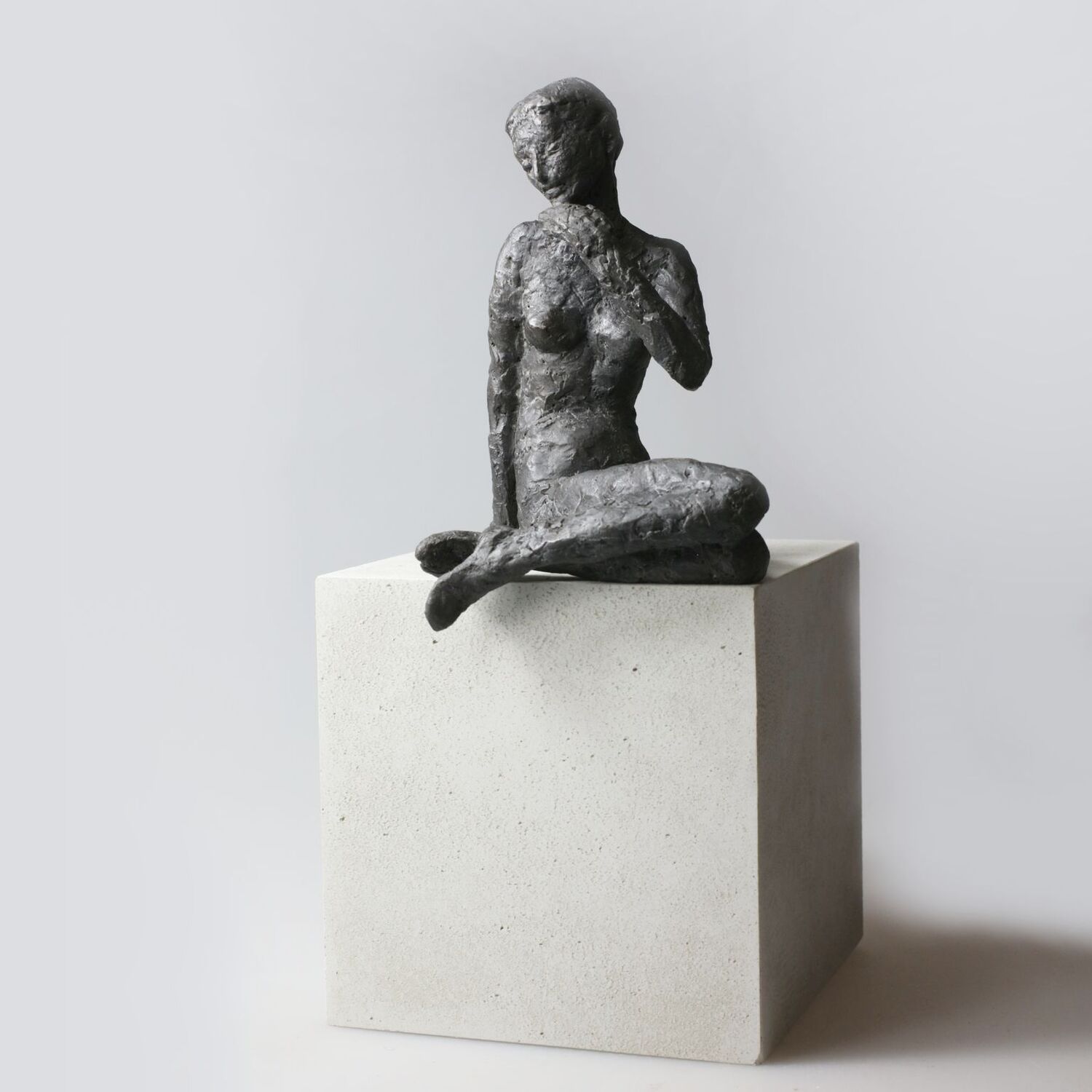 The works of the sculptor Susanne Kraißer, born in Rosenheim in 1977, are in the tradition of figurative sculpture. Her main subject is the classical subject of sculpture and sculpture: the human figure. Kraißer concentrates on the female body. In individual figures, created in series (e.g. Mädchen mit Mini, since 2011; An der Wasserkante, since 2011; Kleine Sitzende, since 2016) or as a singular figure, she primarily thematises formal and essential contrasts such as stability and instability or block-like mass and fragile body formation. In recent years, Kraißer has realised several couple depictions as well as individual figures combined with depictions of fruit or flowers.Susanne Kraißer's bronze sculptures are classic and yet they surprise with new formal inventions, new possibilities of presentation and their very own aesthetics. Kraißer's favourite material is bronze, which she patinates in different ways.